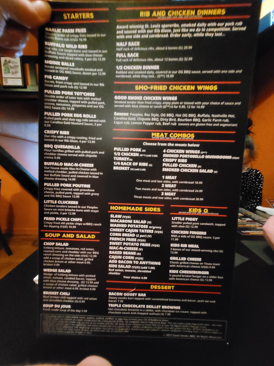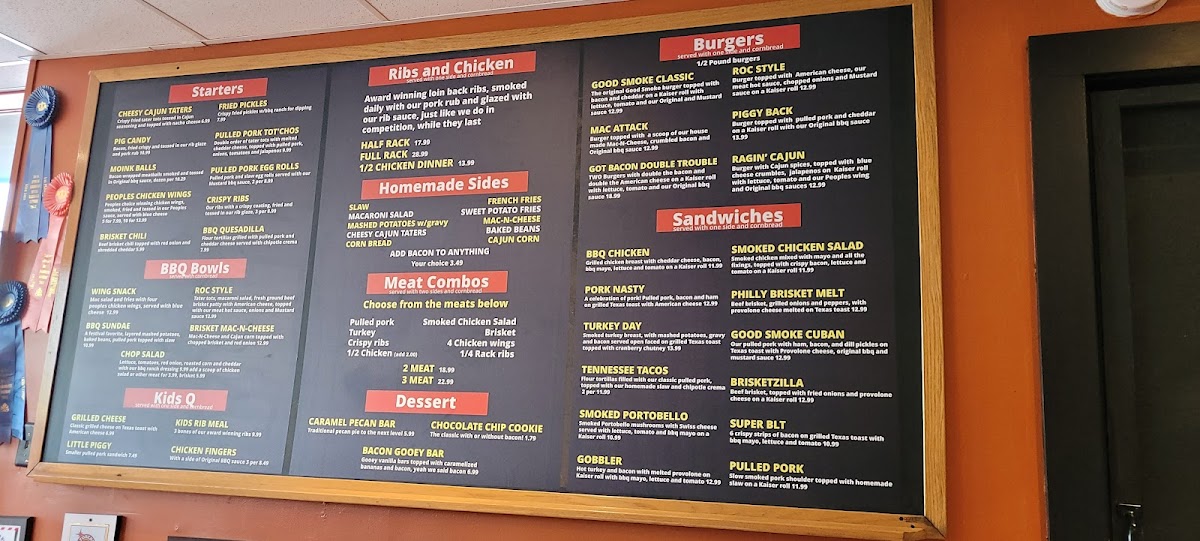 Welcome to Good Smoke BBQ & Pub, your go-to destination for authentic barbecue in East Rochester! Located at 135 W Commercial St, this vibrant pub has quickly become a favorite among locals and visitors alike. The menu showcases an impressive range of smoked meats, including the standout Chicken Dinner, featuring a half chicken, perfectly rubbed and smoked daily, drizzled with their signature OG BBQ sauce and served with homemade cornbread.
